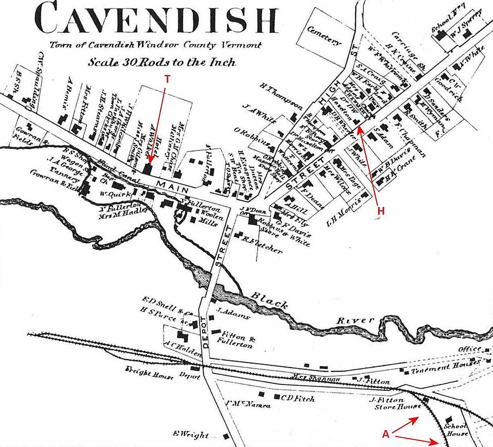 With assistance Phineas clambered aboard an ox cart, and suffered the jarring forty-five minute long, three quarters of a mile ride back to his boarding house (above, T) in Cavendish. , where he waited on his front porch for an hour for the arrival of Dr. Edward Harlow.