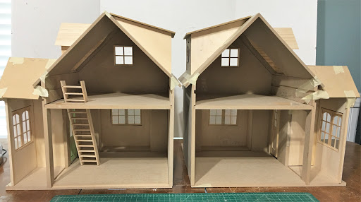 I wanted to make the second cottage a mirror image of the first. This meant creating an additional dado in the floor piece to accommodate the change in wall positions. An easy job for Russ with his big boy table saw. While it seemed as if me and my petite table saw and jigsaw took forever to cut my new walls from 1/4" plywood and the 3/8" MDF, Russ' saw was like cutting butter for him. Luckily, he was happy to help me. I did my best to woo him into being partners in the whole project, but he's just not that into minis and could not be persuaded. :O(