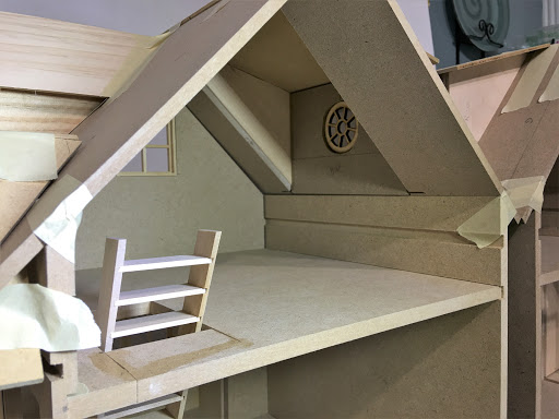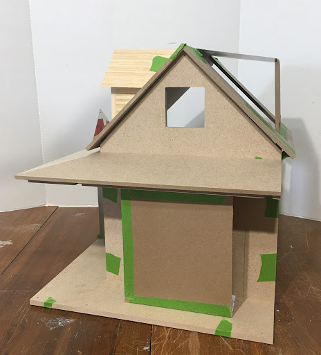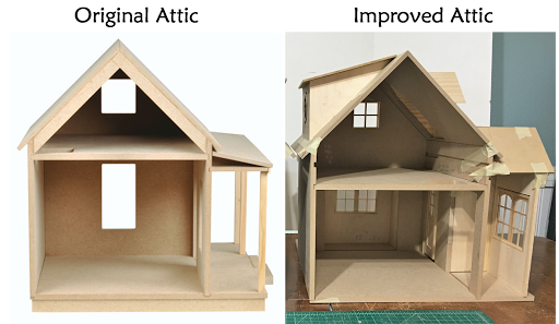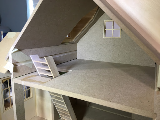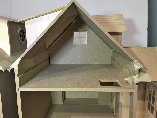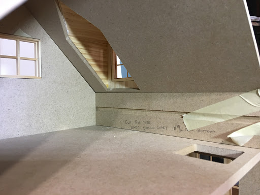 I consulted with my on site contractor (wonderful hubby Russ) to check my ideas for soundness, and because I would need his help and big boy tools to cut new dados in the 3/8" MDF walls. This was necessary because I wanted to reduce the amount of ceiling height on the first floor in order to increase the head room in the attic space. By lowering the second floor (by cutting lower dados into the side walls), the attic now has a knee wall which will great for furniture. The first floor ceiling height is now 7-1/2" and the attic is 8" to the peak. This is perfect because the tallest inhabitant will be 5".