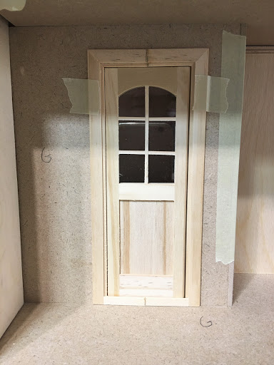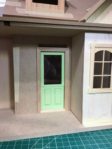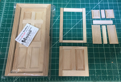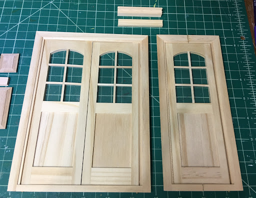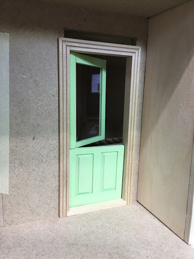 For the second cottage, I could have made another single door but I wanted it to have it's own character. I had a cheap $3 door from China that, with just a little remodeling, made a nice dutch door. First, I removed the door from the frame. Then I cut the door's bottom two panels off, leaving half of the upper frame piece. Next, I removed the metal door pins and heated it in the microwave until the glue softened enough to pull the upper panels and frames apart. After removing the remaining glue residue and sanding, I cut a piece of 1/16" Lexan to make the window. I gave the door a couple light coats of paint so that I could assemble it and not worry about getting paint on the glass. I drilled holes for an additional door pin where the two doors will meet and swing separately. I glued the upper frame pieces together with the Lexan inserted. I had to drill new pin holes in the frame because my door needed to swing the other direction. Thankfully, all the steps went smoothly and the new Dutch door will work well.
